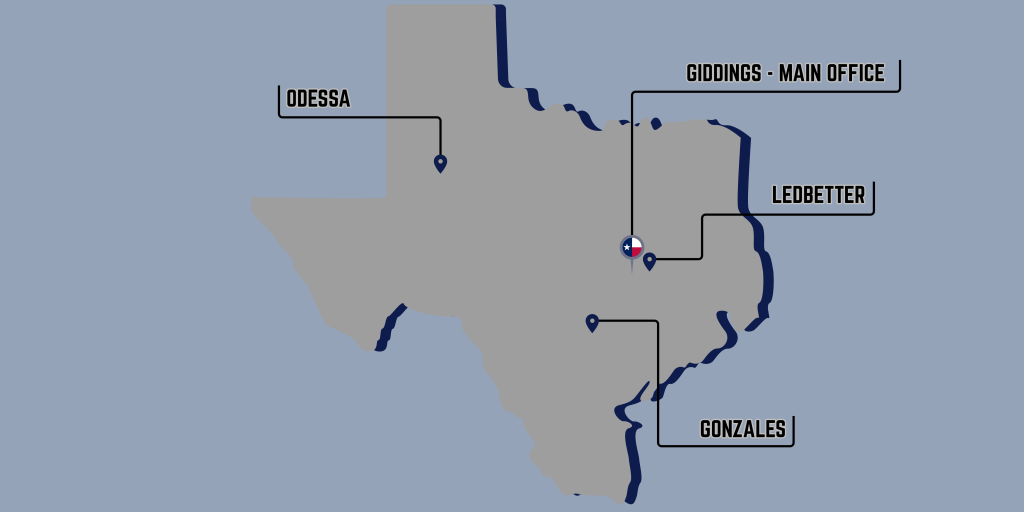 Our Locations Giddings - Main Office 5400 E. Hwy. 290 Giddings, TX 78942 (Physical) PO Box 808 Giddings, TX 78942 (Mailing) 979-542-5104 [email protected] Ledbetter 1229 FM 180 Ledbetter, TX 78946 979-542-1306 [email protected] Odessa 3565 W. 16th St. Odessa, TX 79763 432-614-1318 [email protected] Gonzales 77 FM 108 South, TX 78629 830-437-5575 [email protected]